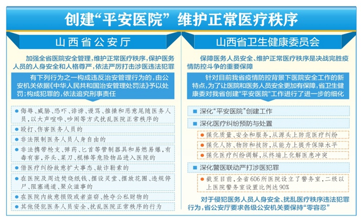 为了进一步巩固我省“平安医院”建设成果,切实有效开展对涉医违法犯罪行为的打击,省公安厅还会同省卫健委认真研究当前我省医疗机构在公共安全方面的管理漏洞,依托山西公安立体化、信息化社会治安防控体系,积极构建和完善医疗机构立体化信息化安全防控网络。要求二级以上公立医院要根据门诊、急诊人流情况,科学设置就诊专用通道;在出入通道建设全自动、半自动、手动式或固定式防撞柱;在医院内部的交通要道、人员密集场所,根据不同的防护需求,建设不同形状和尺寸的防护栏,防止车辆、非法人员冲撞。同时,二级以上公立医院要结合自身实际,在就诊专用通道入口、门急诊大厅、重点临床科室等涉医违法事件易发场所安装配备安检设备,有效提升医院安全防控能力和水平。在此基础上,我省要求通过加强医院警务室建设以及保障医院巡逻守护力量培训,确保涉医案件快速反应、及时查处,提升医院安防能力。