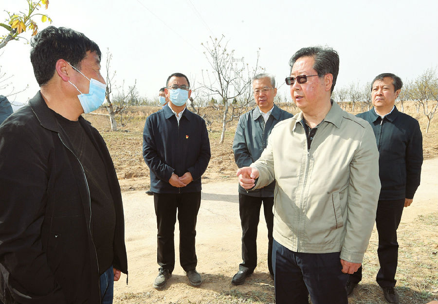 四月十五日,省委书记楼阳生查看石楼县灵泉镇马村经济林提质增效生态扶贫项目,与造林合作社负责人进行交流。记者李联军摄