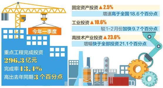 以太焦高铁建设为代表,全省上下掀起项目建设的高潮。一季度重点工程完成投资296.3亿元,完成率13.4%,高出去年同期3个百分点;各级各部门大幅提升网上办理率,扎实开展前期手续办理月活动,前期项目向建设项目转化率已达15.4%,好于往年同期。以项目建设为牵引,一季度,全省固定资产投资增长2.5%,增速高于全国18.6个百分点。其中,工业投资增长10.6%,较1-2月份加快9.7个百分点;高技术产业投资增长23.6%,增幅快于全部投资21.1个百分点。主要经济指标呈现明显回升态势。