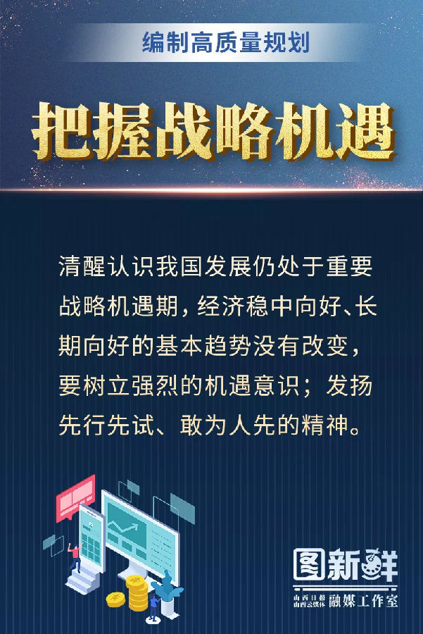 楼阳生强调,要以习近平新时代中国特色社会主义思想为指引,深入学习贯彻“三篇光辉文献”,贯彻落实“四为四高两同步”总体思路和要求,胸怀大局,把握机遇,围绕“转型出雏型”,努力编制一个高质量规划,为谱写中国特色社会主义现代化建设山西篇章描绘蓝图、凝聚力量。