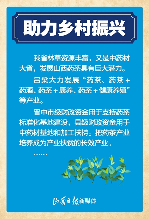当前,山西药茶成为实施乡村振兴战略和脱贫攻坚的新支撑、成为农业转型发展的新亮点、成为高质量发展和高品质生活的新载体。