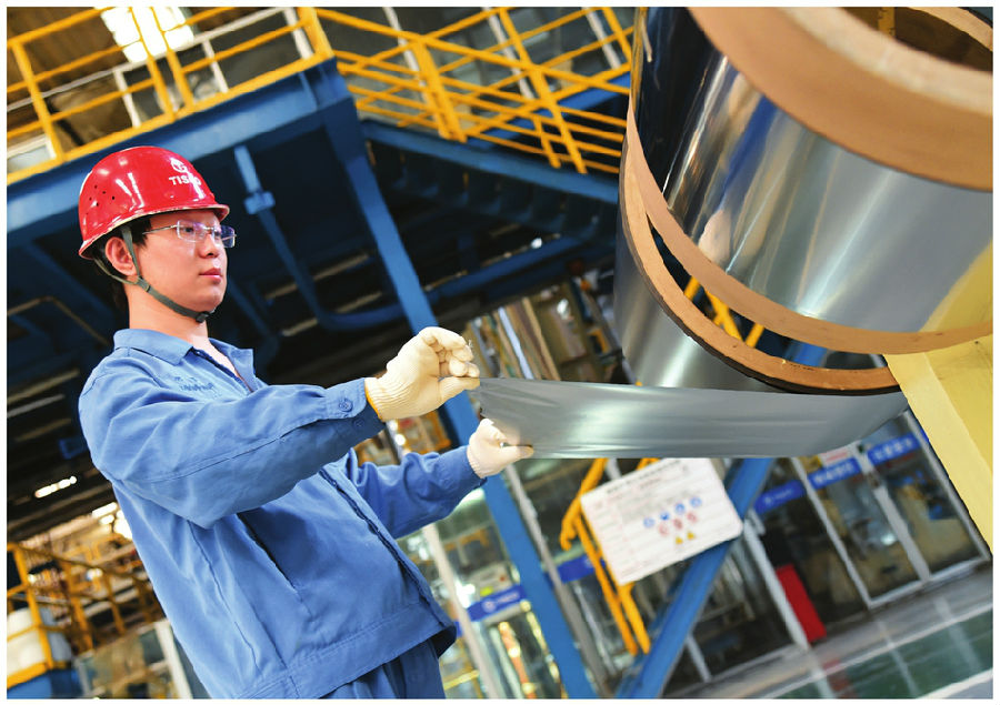 山西坚定贯彻落实习近平总书记关于创新驱动、科教兴国、人才强国的重大战略思想,手撕钢、碳纤维、碳化硅等技术创新取得重大突破。图为太钢集团生产车间正生产手撕钢。该公司2018年研发的宽幅精密带钢箔材(厚度0.02毫米,宽640毫米)成为世界首创,因其厚度不到头发直径的1/3、比A4纸还要薄、可以用手轻易撕开,被形象地称为“手撕钢”。 山西省委宣传部供图