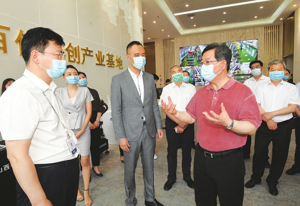 六月六日,在综改示范区某新一代信息技术研发产业基地投产现场,省委书记楼阳生与项目及合作企业负责人深入交流。山西日报记者李联军摄