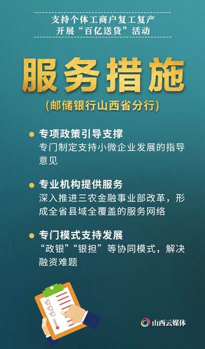 6月9日,省政府新闻办举行新闻发布会介绍,山西省市场监督管理局、中国邮政储蓄银行山西省分行联合开展的“百亿送贷”活动正式启动。活动致力于解决小微企业和个体工商户贷款难、渠道窄、门槛高、成本大的问题,力争使至少20万户小微企业和个体工商户受益。
