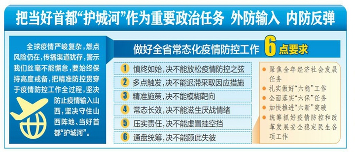 楼阳生对做好全省常态化疫情防控工作提出六点要求:一是慎终如始,决不能放松疫情防控之弦。在常态化疫情防控条件下,一旦放松警惕,就有可能产生疫情新燃点。各级党委和政府、各有关部门特别是主要负责同志要始终把疫情防控作为重要任务,摆在重要议事日程,抓紧抓实抓细常态化疫情防控各项举措,持续巩固来之不易的防控成果,决不能前功尽弃、功亏一篑。二是多点触发,决不能迟滞采取因应措施。抓好防控、兵贵神速。要始终保持灵敏反应的监测预警,一旦有情况,当机立断,立即采取措施。要发扬前期防控工作“百分之百”的精神,充分运用现代信息技术手段,动态摸排识别重点人员,全部纳入闭环管理,坚决防止漏管失控。要建立健全多点触发、灵敏高效的反应机制,明确每个触点的部门责任,防止因贻误战机导致疫情反弹。三是精准施策,决不能模糊靶向。落实“面上放开、点上精准、关口内置、闭环管理”工作策略,找准靶点,对症施策,加强全省农贸市场、海鲜市场等重点场所全面排查和定期、不定期抽检工作,加强生鲜产品冷链流通环节的管理监测,加强邮件等物品消杀工作,进一步提高防控工作的针对性有效性。四是常态长效,决不能滋生厌战情绪。上面松一寸,下面松一尺。各级各部门特别是主要负责同志要始终保持定力耐力,做好长期作战的思想准备、工作准备,对防控漏洞再排查、对防控重点再加固、对防控要求再落实,织密织牢疫情防控网,做到一天不胜、一刻不松,一抓到底直至全胜。五是压实责任,决不能虚置挂空挡。严格落实机关部门、企事业单位、社团机构等所有法人单位及农村社区防控责任,强化公民义务责任,打好疫情防控人民战争。要抓好各级各类学校疫情防控工作,住校的严格封闭管理,走读的“两点一线”闭环管理,落实学校、家长、学生“三位一体”防控责任。要引导广大群众自觉不聚集,坚持疫情防控中养成的戴口罩、勤洗手、常通风良好卫生习惯,抓好《山西省禁止公共场所随地吐痰的规定》的执行落实,化风成俗,培育健康生活方式。六是通盘统筹,决不能顾此失彼。聚焦全年经济社会发展任务,扎实做好“六稳”工作,全面落实“六保”任务,加快推进“六新”突破,统筹抓好疫情防控和改革发展安全稳定民生各项工作。要落实好“项目为王”要求,省市县各级要持续推进项目投产一批、开工一批、签约一批“三个一批”活动,让更多好项目、大项目、新项目落地、建成、达效。各开发区要通过晒项目、亮数据、比成绩、找差距,进一步在全省形成大抓项目的浓厚氛围。要紧盯开发区督察中发现的问题,狠抓整改落实,强化规划引领管控,把明确“四至”范围、实现“多规合一”等基础性工作落实到位,发挥好开发区主战场、主阵地、主引擎作用,助推高质量转型发展。