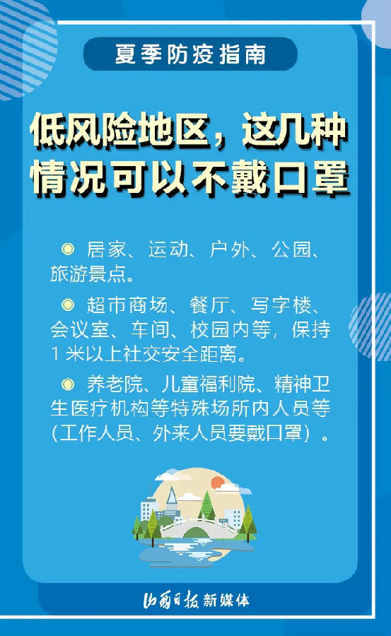 近日,国家卫健委发布夏季低风险地区防控指南。哪些防疫提示需要注意?低风险地区哪些情况可以不用戴口罩?8张海报了解一下!