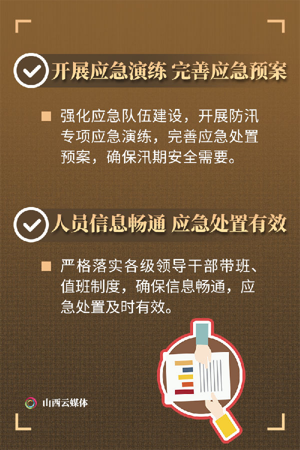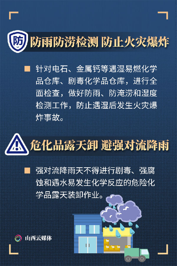 近日,山西省应急管理厅下发通知,对做好化工和危险化学品生产经营企业汛期安全生产工作提出“十条”要求。5张海报,了解具体内容。
