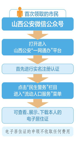 首次领取的市民,只需打开山西公安微信公众号进入山西公安“一网通办”平台,实名注册认证后,点击“民生警务”栏目,进入“流动人口服务”菜单,即可查看、展示、下载本人的电子居住证。电子居住证的申领,不收取任何费用。记者看到,“一网通办”平台里的电子居住证登载了流动人口的姓名、性别、民族、人像、公民身份号码、户籍所在地、现居住地址、有效期限等信息,并新增了二维码核验信息。