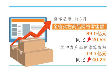 数字显示,前5月,全省实物商品网络零售额89.0亿元,同比增长20.5%,其中农产品网络零售额19.7亿元,同比增长40.2%。