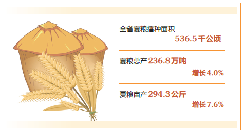7月21日,我省公布上半年经济运行数据,农业生产形势喜人,夏粮总产达到236.8万吨,增长4.0%;夏粮亩产294.3公斤,增长7.6%,再创历史新高。