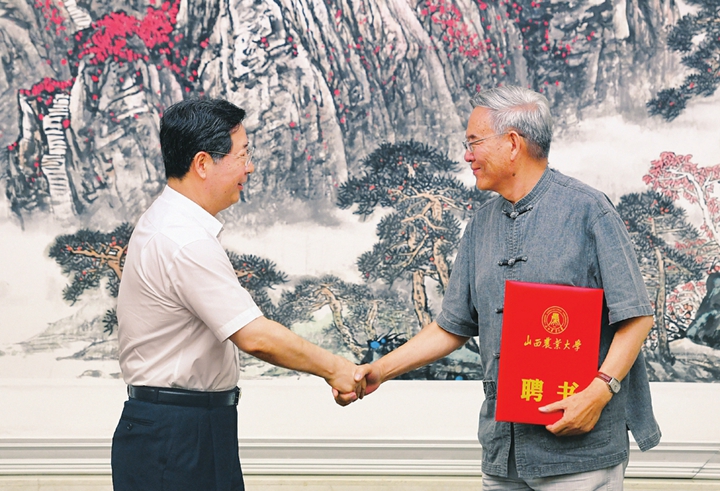 八月二十三日,省委书记楼阳生为受聘担任山西农业大学学术院长的中国工程院院士、兰州大学教授南志标等颁发聘书。记者史晓波摄
