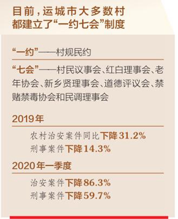 目前,运城市大多数村都建立了“一约七会”制度——“一约”是村规民约,“七会”是村民议事会、红白理事会、老年协会、新乡贤理事会、道德评议会、禁赌禁毒协会和民调理事会。这“一约七会”制度的不断健全,对破除乡村社会陋习、引导群众移风易俗、引领社会新风、化解矛盾纠纷,维护基层社会和谐稳定起到了重要作用。村民的正能量多了,乡村的负面事情少了,社会治安状况得到明显改善,群众安全感显著增强。2019年运城市农村治安案件同比下降31.2%,刑事案件下降14.3%;2020年一季度,治安案件下降86.3%,刑事案件下降59.7%。