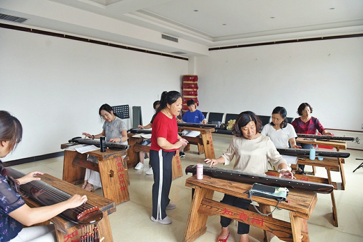 闻喜县离退休干部在专业老师的指导下练习古筝,实现老有所养、老有所乐。