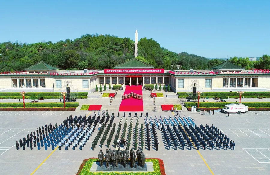 九月三日上午,山西省纪念中国人民抗日战争暨世界反法西斯战争胜利七十五周年向抗战烈士敬献花篮仪式在武乡县八路军太行纪念馆举行。图为敬献花篮仪式现场。张国平摄