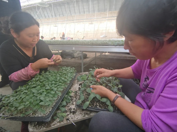 ▲农妇在大棚内进行嫁接工作