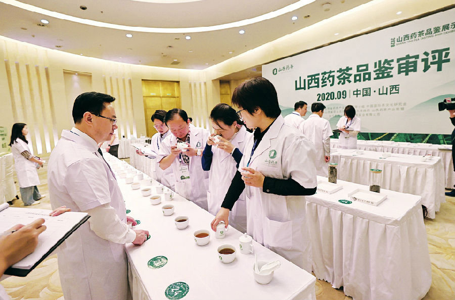 山西药茶品鉴审评专家评委们正在品鉴药茶。 本报记者史晓波摄
