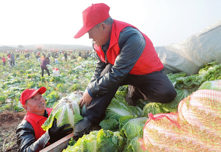 长治市新时代文明实践志愿者帮助农民收获蔬菜。