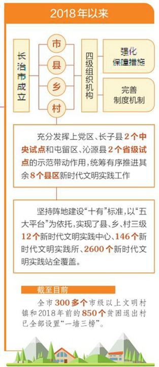2018年以来,长治市深入推进新时代文明实践工作,完善组织架构,明确市级指导、县级统筹、乡村两级落实的工作模式,在市县乡村四级设置组织机构,强化保障措施,完善制度机制,充分发挥上党区、长子县2个中央试点和屯留区、沁源县2个省级试点的示范带动作用,统筹有序推进其余8个县区新时代文明实践工作。坚持阵地建设“十有”标准,以“五大平台”为依托,实现了县、乡、村三级12个新时代文明实践中心、146个新时代文明实践所、2600个新时代文明实践站全覆盖。