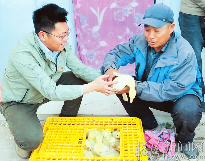 俞贺楠(左)把鹅苗送到贫困群众手中。
