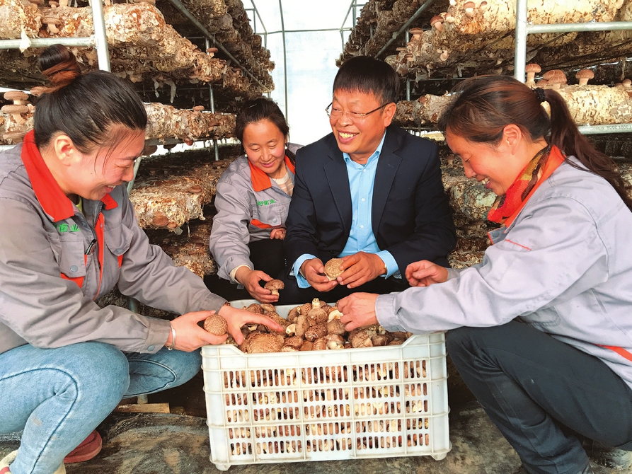 常明昌(右二)在地头和群众一起分享香菇丰收的喜悦。