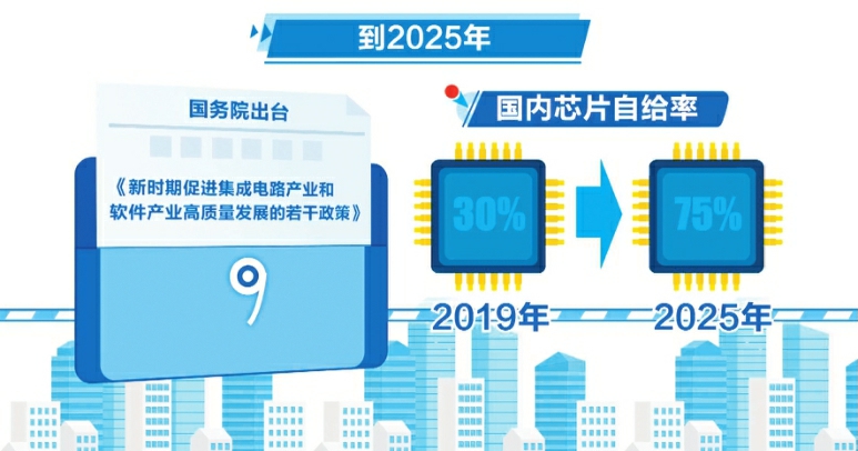 今年8月初,国务院出台了《新时期促进集成电路产业和软件产业高质量发展的若干政策》,提出到2025年,国内芯片自给率从2019年的30%达到75%。对于制程小于28纳米,经营期15年以上的头部企业,最高可享受十年的免税期。