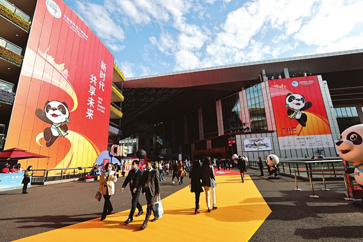 11月5日,第三届中国国际进口博览会的吉祥物“进宝”在场馆内外格外引人注目。记者史晓波摄