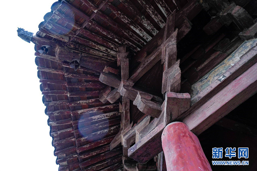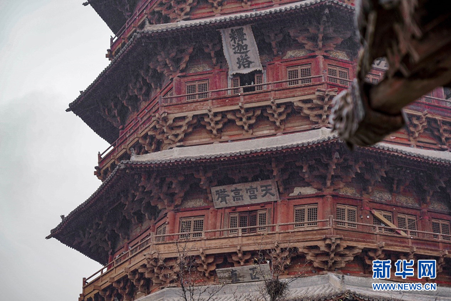 从外表看,木塔第一层立面重檐,以上各层均为单檐,共五层六檐。实际上,各层间夹设暗层,实为九层。新华网 发