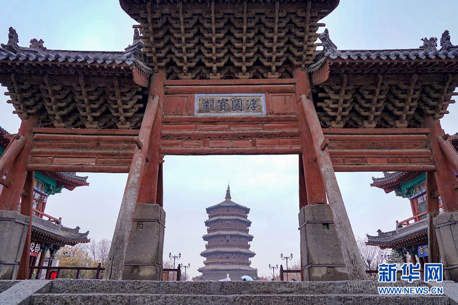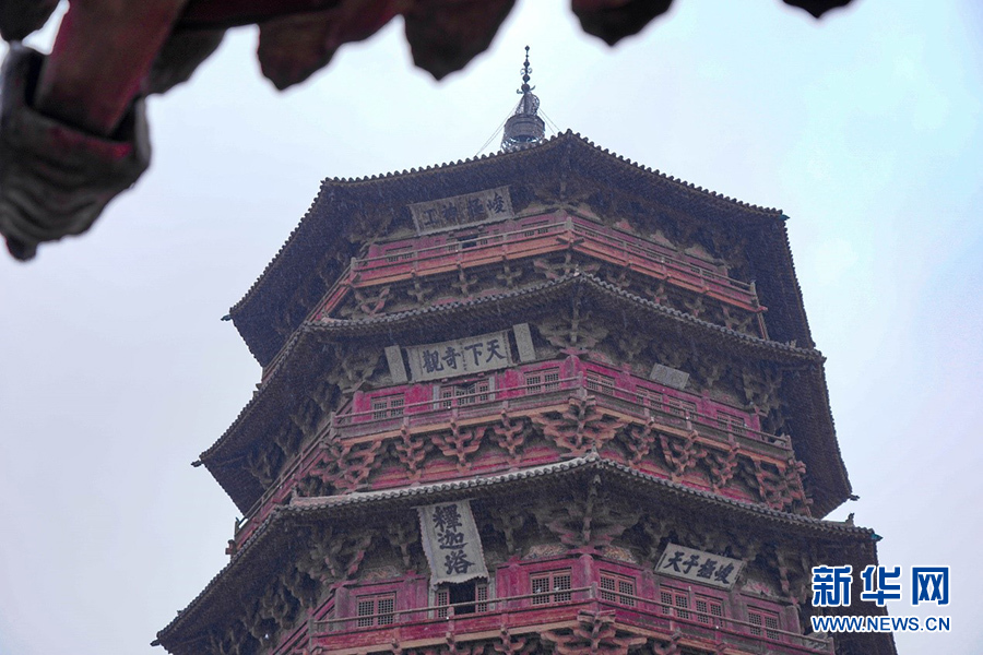应县木塔,又称佛宫寺释迦塔,位于山西省朔州市应县城西北佛宫寺内,建于1056年,塔高67.31米,相当于一座20多层高的现代建筑,被列为第一批全国重点文物保护单位。它与法国埃菲尔铁塔、意大利比萨斜塔并称“世界三大奇塔”。11月18日,参加第十五届全国网络媒体山西行活动的记者编辑走近这座千年古塔,感受中国古代建筑艺术的魅力。新华网 发