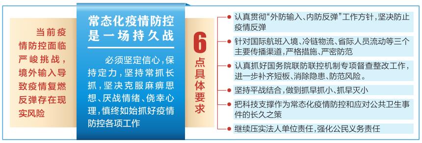 楼阳生指出,常态化疫情防控是一场持久战。当前疫情防控面临严峻挑战,境外输入导致疫情复燃反弹存在现实风险。必须坚定信心,保持定力,坚持常抓长抓,坚决克服麻痹思想、厌战情绪、侥幸心理,慎终如始抓好疫情防控各项工作。楼阳生提出六点具体要求。一是认真贯彻“外防输入、内防反弹”工作方针,把握“面上放开、点上精准、关口内置、闭环管理”工作策略,科学合理安排调度防控力量,落实各项防控措施,坚决防止疫情反弹。二是针对国际航班入境、冷链物流、省际人员流动等三个主要传播渠道,严格措施、严密防范,不断提高防控工作针对性有效性。要充分利用大数据等新技术,动态掌握途晋入晋人员情况,加强闭环管理。要实行进口冷链食品总仓管理,落实进口冷链食品预防性消毒、核酸检测和集中管理制度,做到“凡进必检”,守好防范“冷链输入”关口。要发挥基层组织优势,所有农村社区、法人单位要全面掌握辖区内人员与中高风险地区流动情况,切实看好自家门、管住自家人。三是认真抓好国务院联防联控机制专项督查整改工作,坚持问题导向,对督查反馈的问题限期整改到位,进一步补齐短板、消除隐患、防范风险。四是坚持平战结合,着眼有效应对突发事件,加强医疗物资和专业力量储备,完善应急处置预案和工作机制,一旦发生疫情燃点爆点,确保第一时间转为战时状态,做到抓早抓小、抓早灭小。五是把科技支撑作为常态化疫情防控和应对公共卫生事件的长久之策,持续加大防疫科研攻关力度,支持疫苗、检测试剂、特效药物研发,加强技术储备,不断提升科研能力和水平。六是继续压实法人单位责任,强化公民义务责任,引导广大群众保持疫情防控中养成的少聚集、戴口罩、勤洗手、常通风、禁吐痰等良好卫生习惯,全社会共同努力,打好打赢疫情防控人民战争。