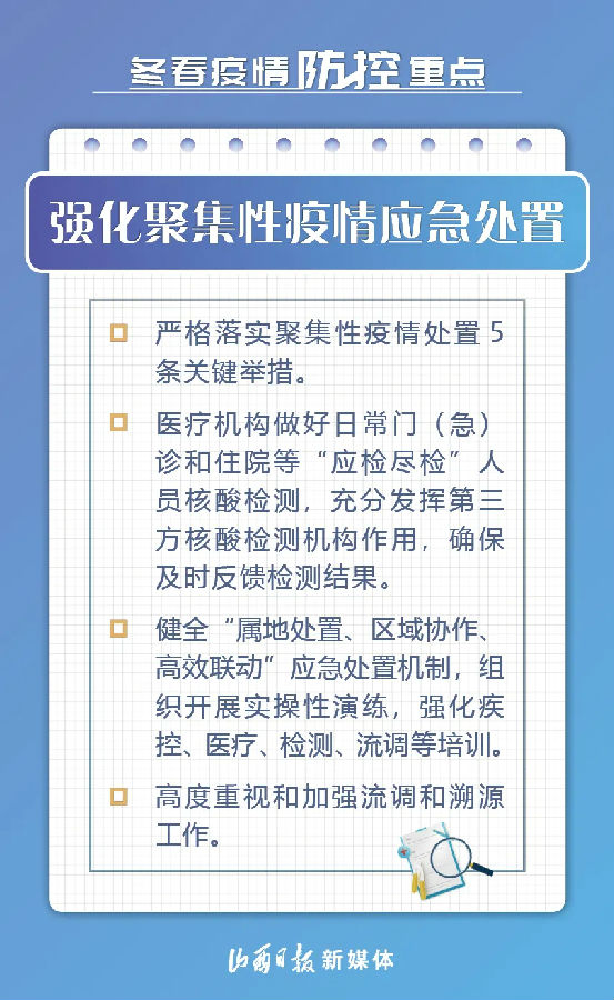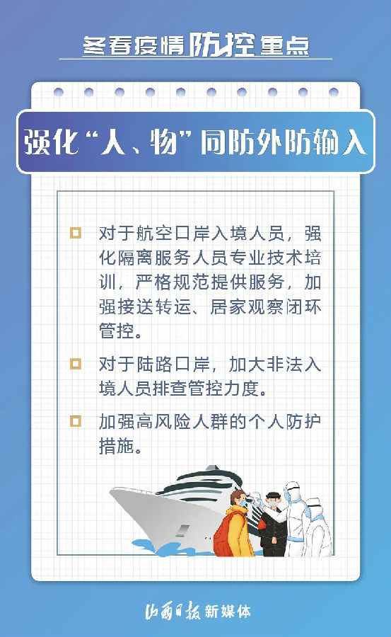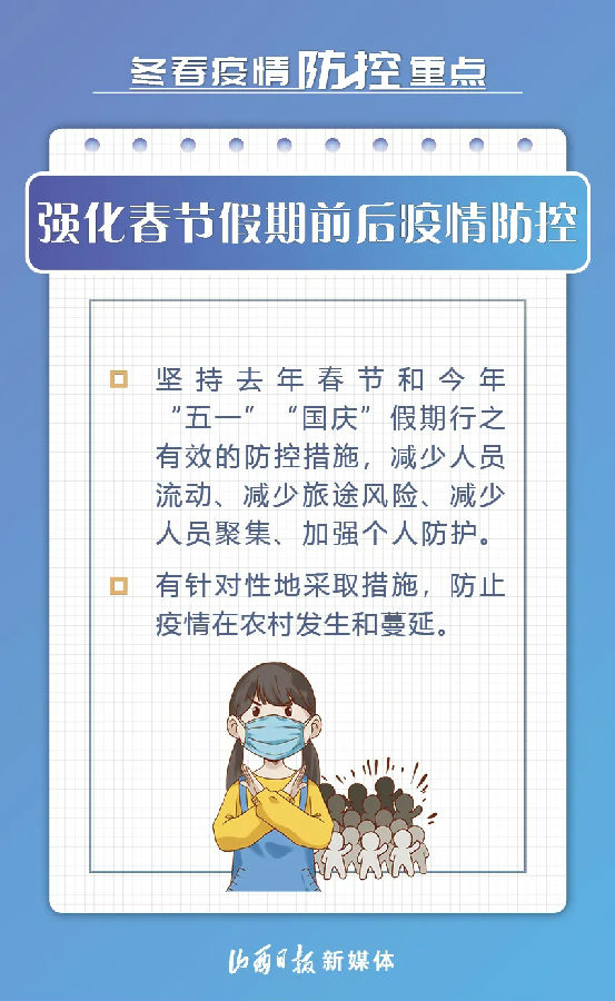 今冬明春疫情防控形势依然严峻复杂。11月22日,全国卫生健康系统电视电话会议召开。会上表示,各地坚决克服麻痹思想、厌战情绪、侥幸心理、松劲心态,严格落实“外防输入、内防反弹”措施,坚决守住冬春季疫情防线,各地要重点加强5个方面的工作。