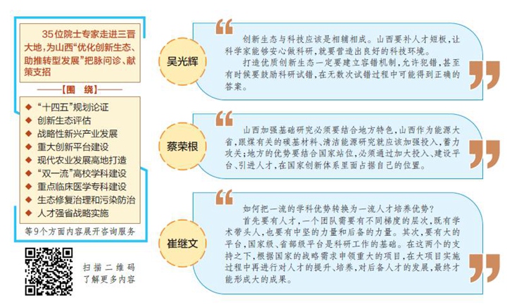 山西比历史上任何时期都更加需要创新、渴求人才。院士专家的真知灼见号准了我们的脉,打开了我们的思路,充分发挥了高层次人才“思想库”和“智囊库”的作用