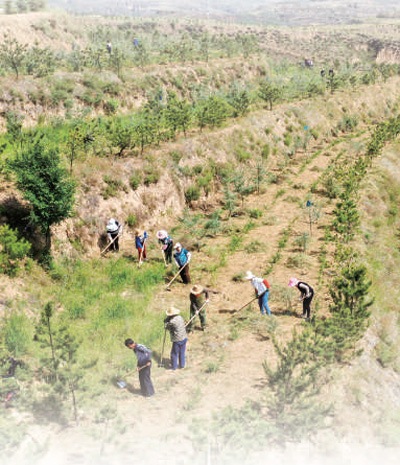 岚县普明镇一家造林专业合作社的社员们在管护锄草(摄于今年6月)。 |