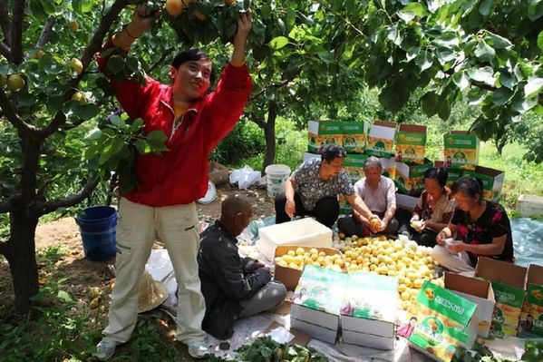 白水大杏成为繁峙县脱贫致富的好产业。图为果农正在采摘包装大杏。乔伟摄