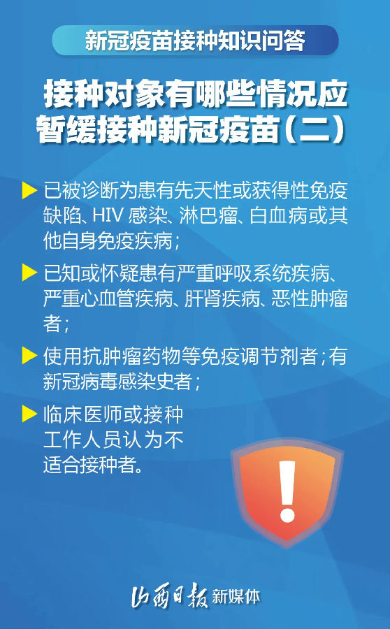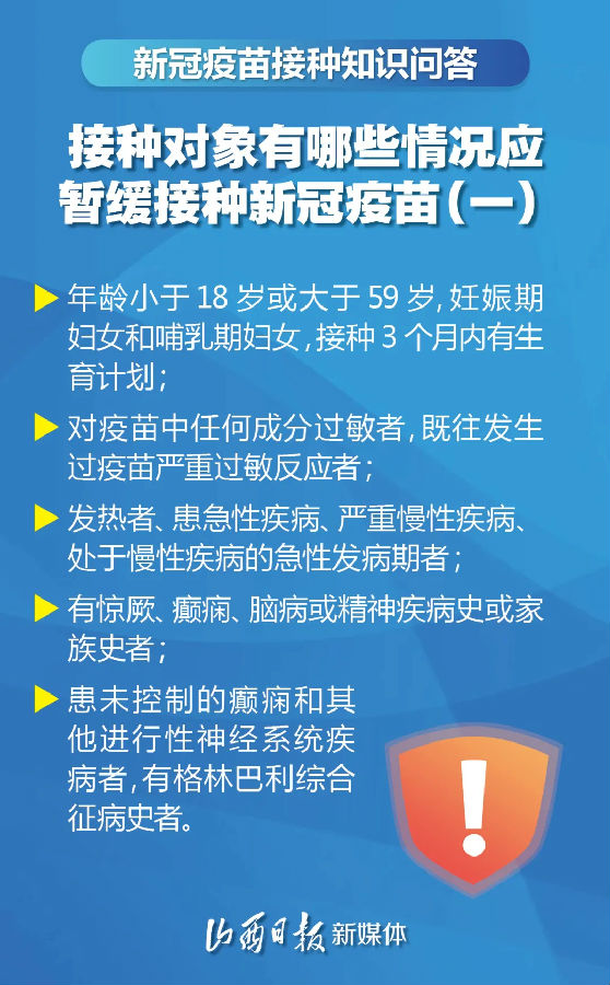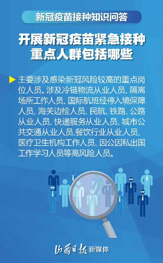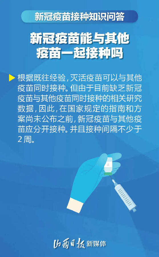 目前,山西省重点人群新冠疫苗接种工作已经全面启动,开展新冠疫苗紧急接种重点人群包括哪些?哪些情况应暂缓接种新冠疫苗?新冠疫苗能与其他疫苗一起接种吗?……关于新冠疫苗接种,你想知道的都在这里。