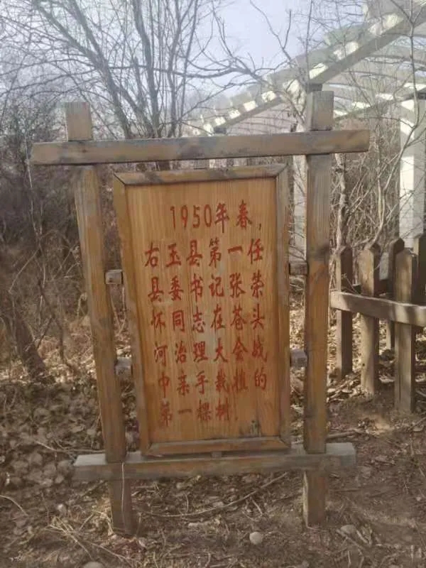 这是1950年右玉县第一任县委书记张荣怀在苍头河治理大会战中亲手栽种的第一棵树……
