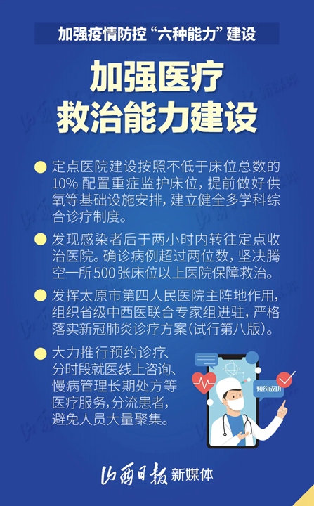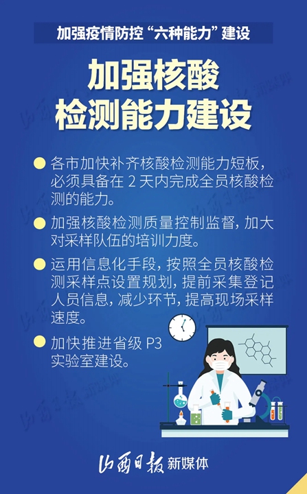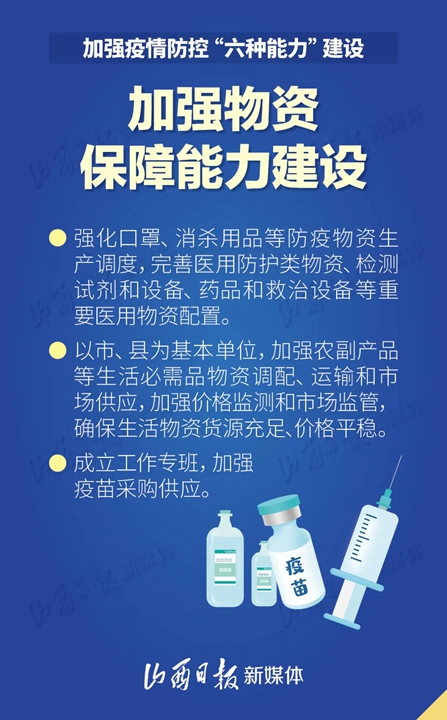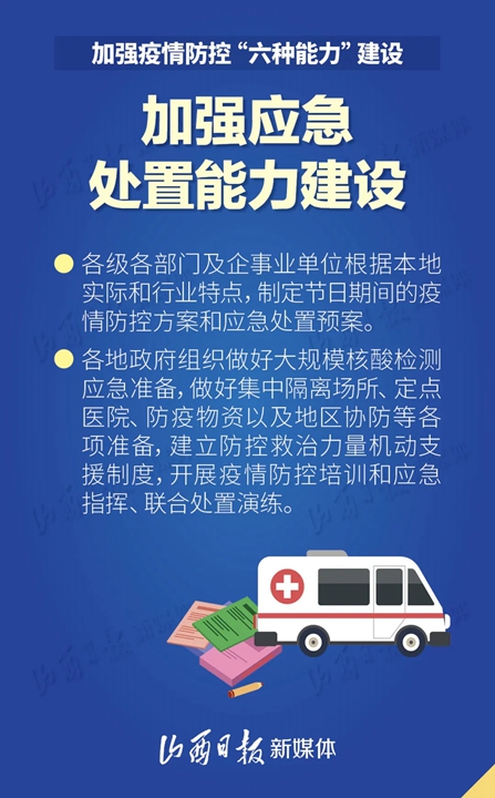 新春将至,为保障全省人民群众度过一个安全健康的春节,守住不发生疫情蔓延扩散底线,巩固来之不易的防疫成果。山西省新冠肺炎疫情防控工作领导小组就春节期间疫情防控具体措施提出了加强“六种能力”建设的要求。