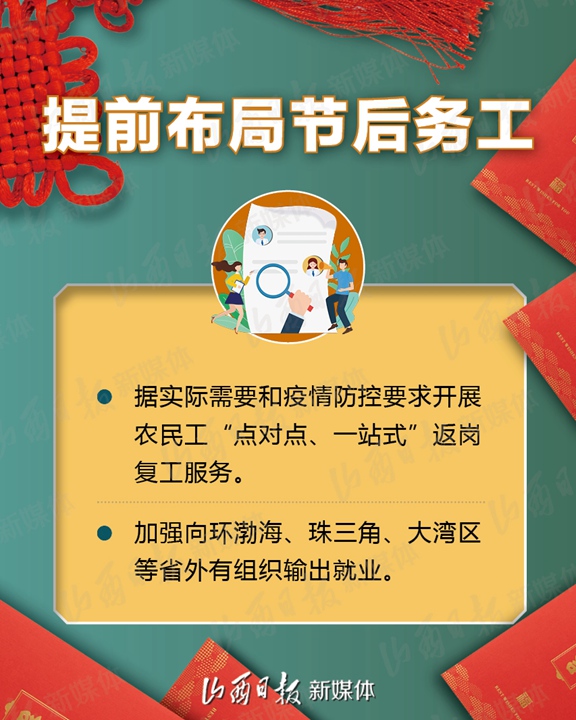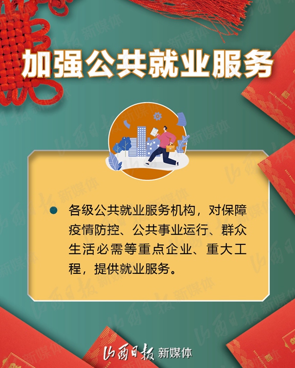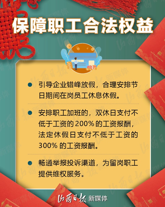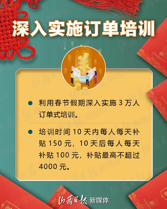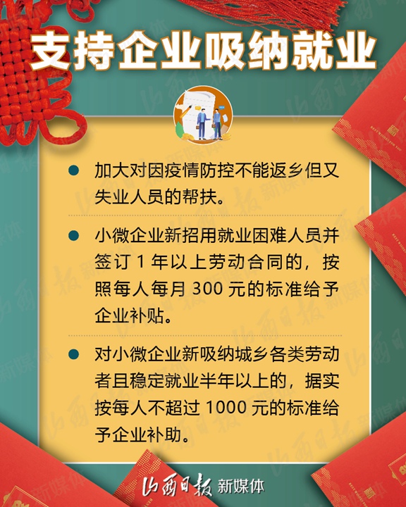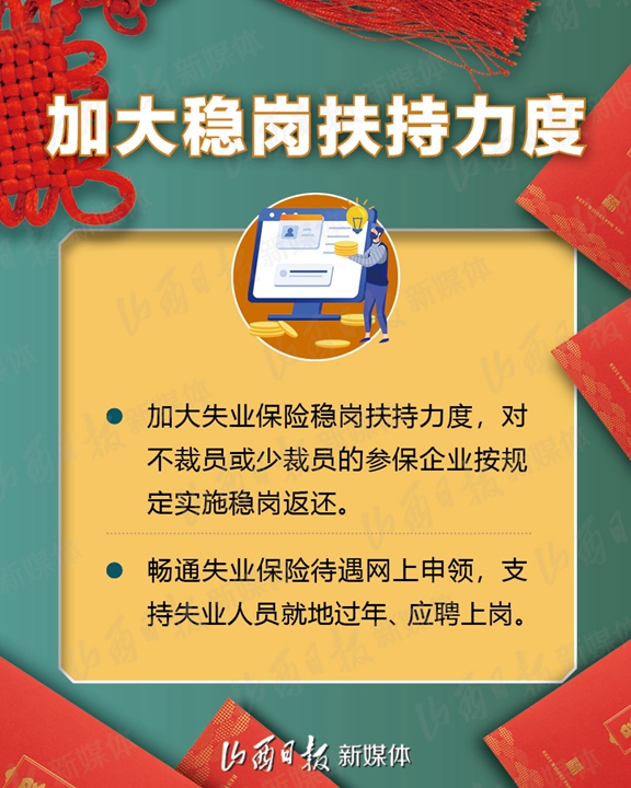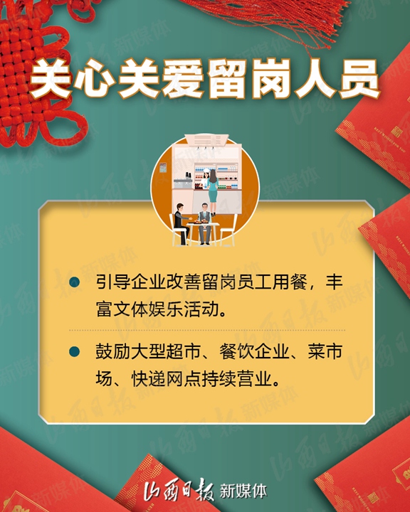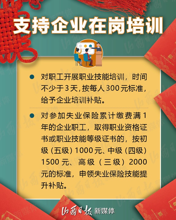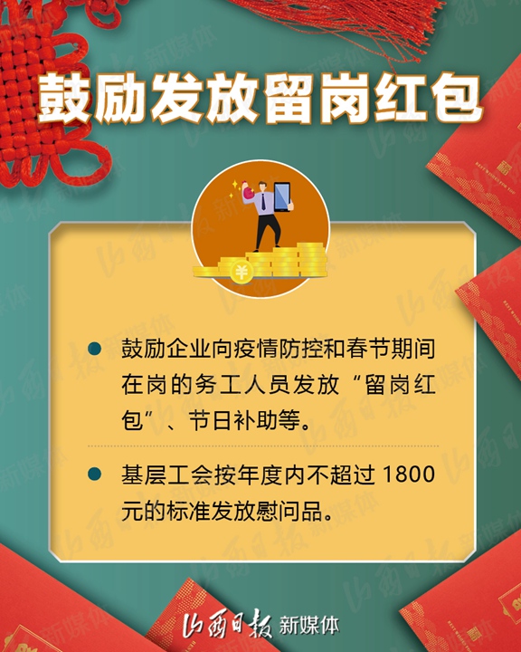 支持企业春节期间在岗培训、实施3万人订单式培训、鼓励发放留岗红包……2月1日,省人社厅、省财政厅、省工信厅、省小企业局、省卫健委、省交通厅、省总工会7部门联合下发《关于疫情防控和春节期间稳岗留工的通知》,加大政策支持力度,拿出真金白银鼓励企业春节期间稳岗留工,确保员工健康安全、企业生产有序、就业形势总体稳定。