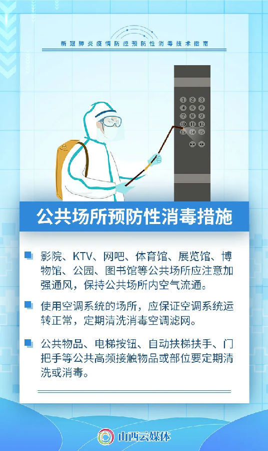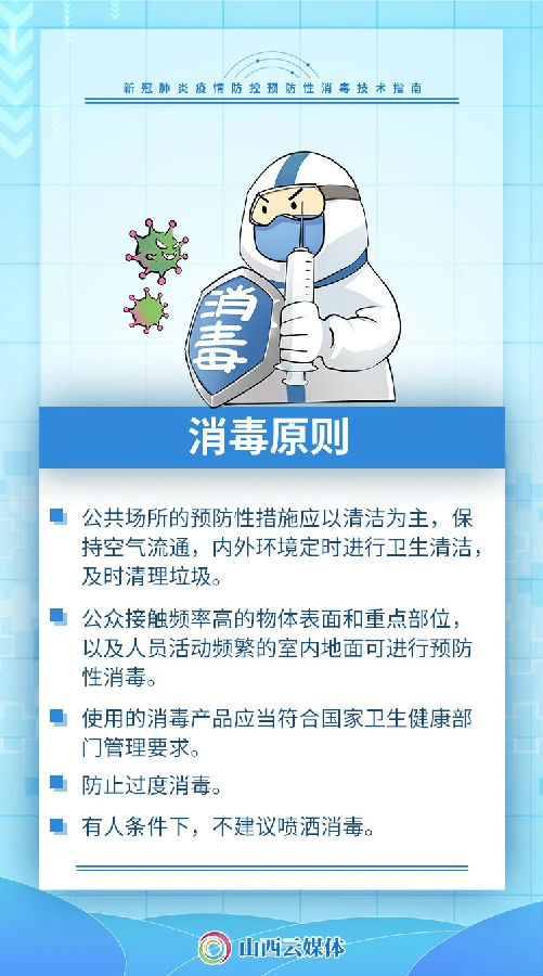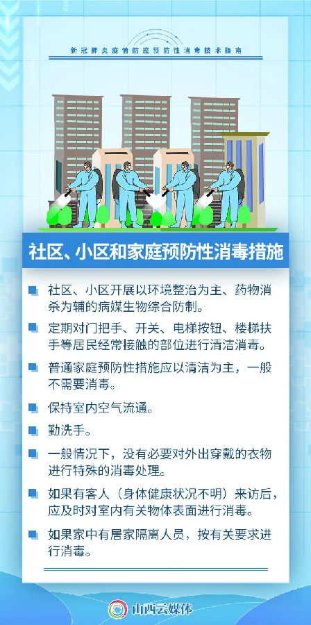 为做好我省新型冠状病毒肺炎流行期间的预防性消毒工作,指导有关部门和单位开展预防性消毒,近日,省疫情防控办制定了《山西省新冠肺炎疫情防控预防性消毒技术指南》,对疫情防控预防性消毒做出技术指导。