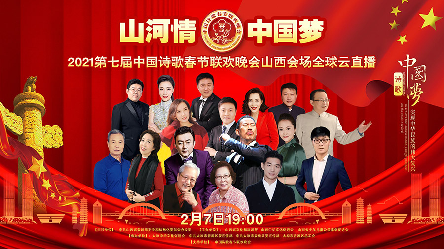黄河新闻网讯 2月7日,“山河情·中国梦”2021第七届中国诗歌春晚山西会场将通过山西50余家网媒向全球“云”直播。山西会场是中国诗歌春晚全球近百个会场中的重点会场之一。届时,中国诗歌春晚全球会场和近50个国家的诗人将关注晚会。