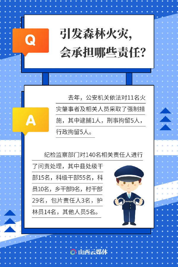 去年,公安机关依法对11名火灾肇事者及相关人员采取了强制措施,纪检监察部门对140名相关责任人进行了问责处理。