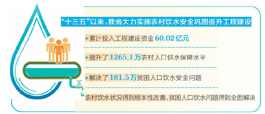 “十三五”以来,我省大力实施农村饮水安全巩固提升工程建设,累计投入工程建设资金60.02亿元,提升了1265.1万农村人口供水保障水平,解决了181.5万贫困人口饮水安全问题,农村饮水状况得到根本性改善,贫困人口饮水问题得到全面解决。