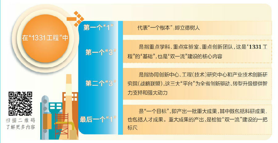 在“1331工程”中,第一个“1”代表“一个根本”,即立德树人;第一个“3”是指重点学科、重点实验室、重点创新团队,这是“1331工程”的“基础”,也是“双一流”建设的核心内容;第二个“3”是指协同创新中心、工程(技术)研究中心和产业技术创新研究院(战略联盟),这三大“平台”为全省创新驱动、转型升级提供智力支持和强大动力;最后一个“1”是“一个目标”,即产出一批重大成果,其中既包括科研成果,也包括人才成果。重大成果的产出,是检验“双一流”建设的一把标尺。