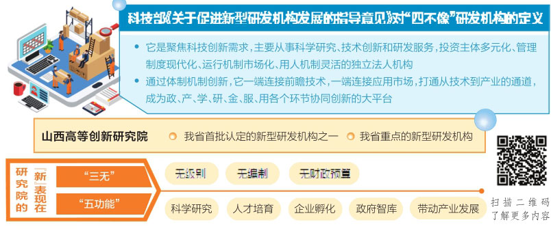 山西高等创新研究院是我省首批认定的新型研发机构之一,也是我省重点的新型研发机构。研究院的“新”表现在“三无”,无级别、无编制、无财政预算;“五功能”,科学研究、人才培育、企业孵化、政府智库、带动产业发展。张润泽认为,新型研发机构打破了创新资源配置的壁垒,将创新资源有效聚集,在互动中产生效应。比如,新型研发机构解决了投入多元化难题,既有社会投入、服务收入、财政资助,又有项目研发经费收入等。解决了投入,还赋予研发花钱的自主权,不会让科学家因买一包纸的问题去层层审批。通过几方面资源配置,就能引来一流人才、研发一流课题、搭建一流平台、产生一流成果,这样,新型研发机构就能承担起我省打造一流创新生态的重要任务。