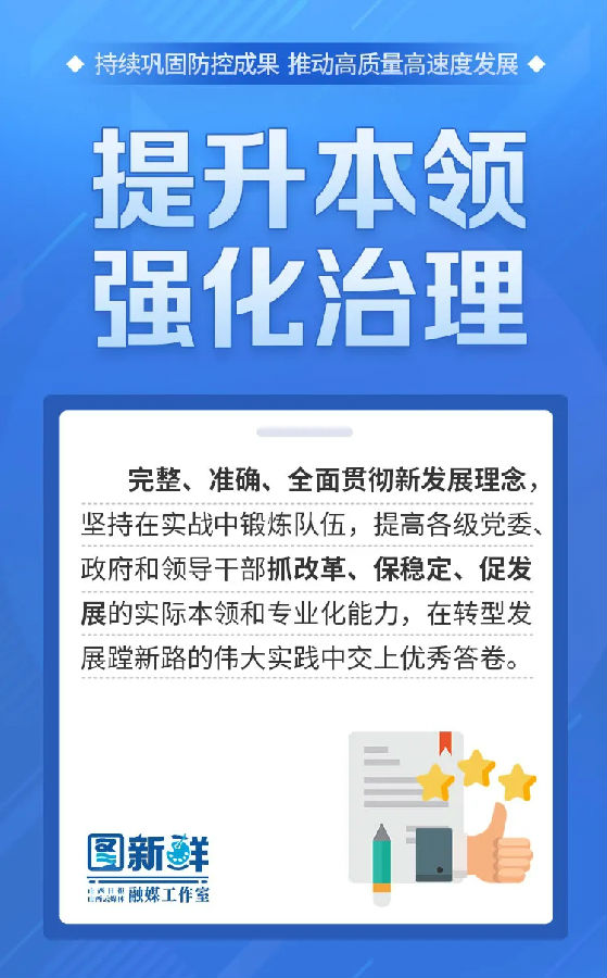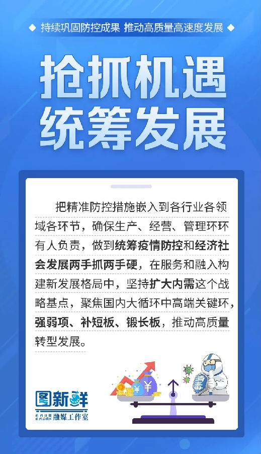 他强调,要认真贯彻落实习近平总书记关于疫情防控重要指示精神和党中央决策部署,坚持“外防输入、内防反弹”工作方针,不断巩固常态化疫情防控成果,加强经济运行监测和调度,促进经济稳定增长,努力实现争先进位,开创“十四五”转型出雏型新局面。