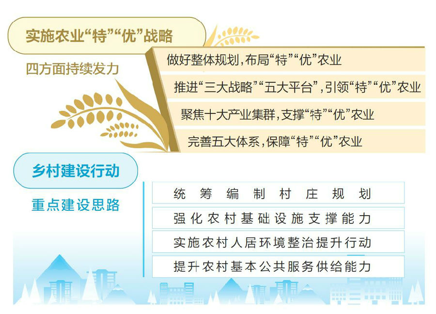 四是完善五大体系,保障“特”“优”农业。实施品种培优、品质提升、品牌打造和标准化生产的“三品一标”行动,发展乡村旅游、电子商务等新产业新业态,构建农业产业体系。坚持良种良法配套、农机农艺融合,发展有机旱作农业、设施农业、节水农业,提升农业生产体系。抓好家庭农场、农民合作社、龙头企业、产业化联合体等新型经营主体,完善农业经营体系。大力培育市场化服务主体,充分发挥高校和科研院所作用,重构农技推广体系。围绕实现小农户与现代农业有机衔接,壮大社会化服务组织,开展全产业链服务,培育农业服务体系。通过实施“特”“优”战略,把资源优势变为产业优势、经济优势、发展优势,加快推进农业农村现代化,促进乡村全面振兴。