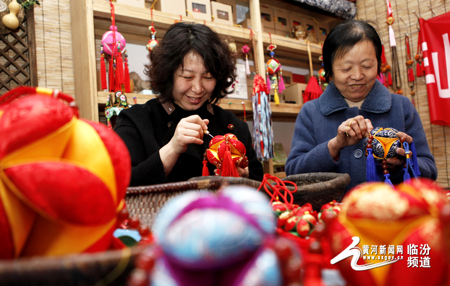 图为3月6日,在临汾市襄汾县赵康村红红传统手工专业合作社,妇女们围坐在一起精心制作“太平绣球”。李现俊 摄