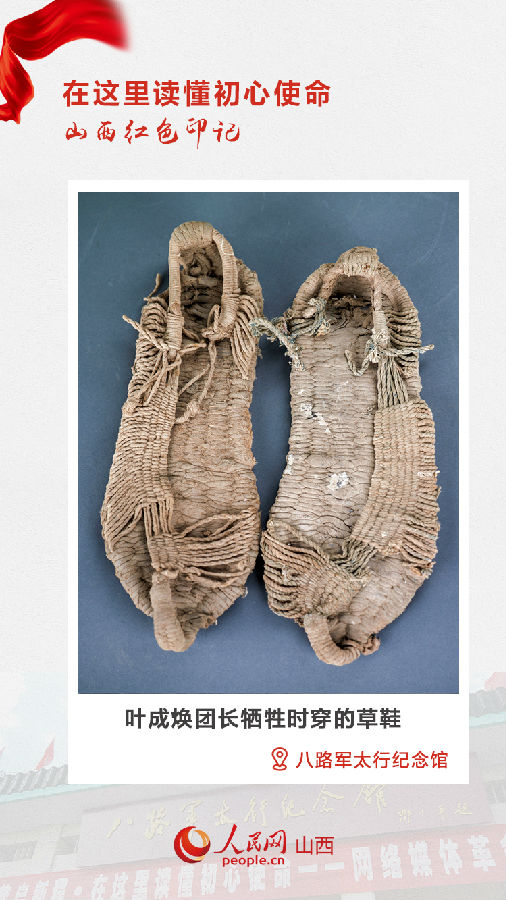 在为他整理遗物的时候,民兵队长董来旺看见叶团长脚上穿的草鞋已经被鲜血浸透,就把自己的布鞋脱下来给叶团长换上,自己穿上了叶团长的草鞋。这双草鞋就这样保存了下来,成为八路军将士浴血奋战的见证。