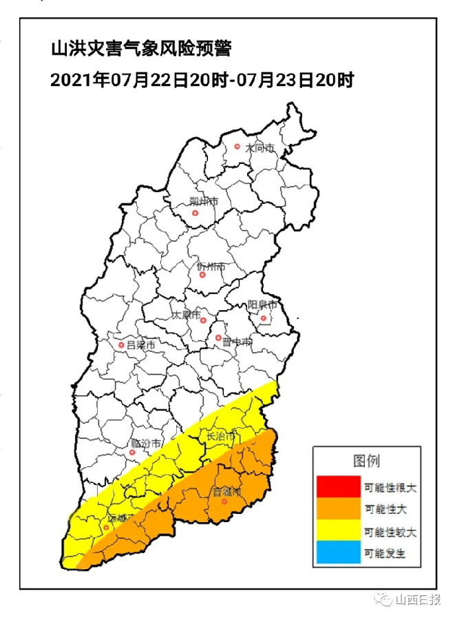 预计,2021年7月22日20时至7月23日20时,强降雨可致运城西部、临汾东南部、长治中部发生山洪的可能性较大(黄色预警),运城东部、晋城、长治东南部发生山洪的可能性大(橙色预警)。请上述地区有关单位和部门做好实时监测、防汛预警和转移避险等工作;广大群众安排好生产生活,远离边山峪口,避开山洪沟道,注意防范洪水威胁。
