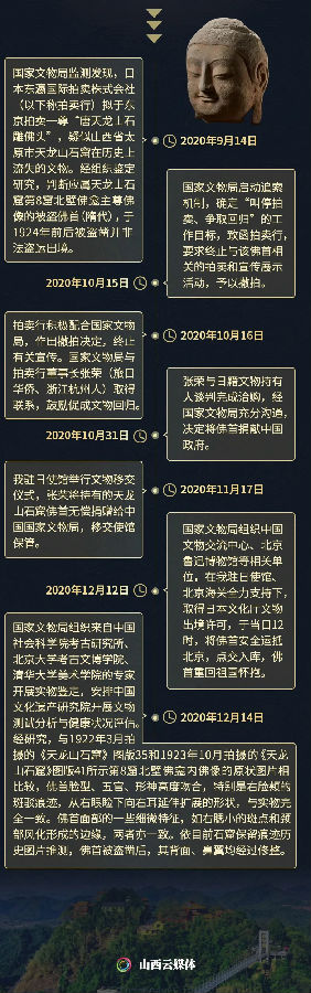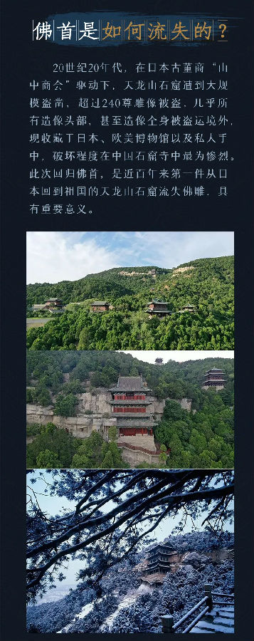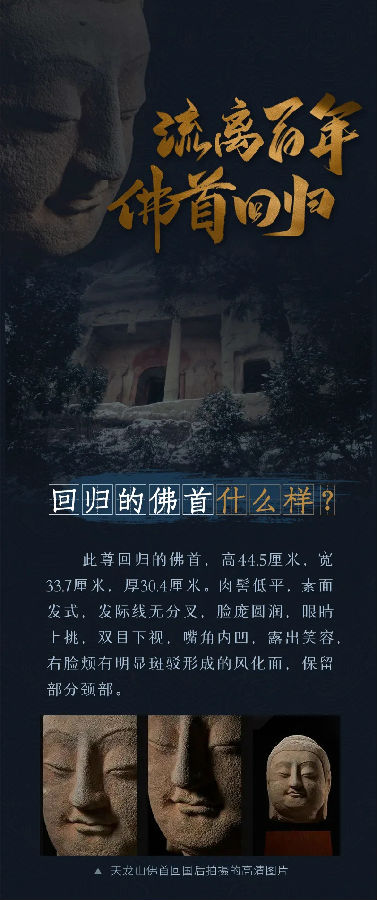 7月24日上午,天龙山石窟“第8窟北壁主尊佛首”正式回归原属地,亮相当日在太原市天龙山石窟博物馆开幕的“复兴路上 国宝归来”特展,并在此长期陈列展出。它成为近百年来第一件从日本回归天龙山石窟的珍贵流失文物。