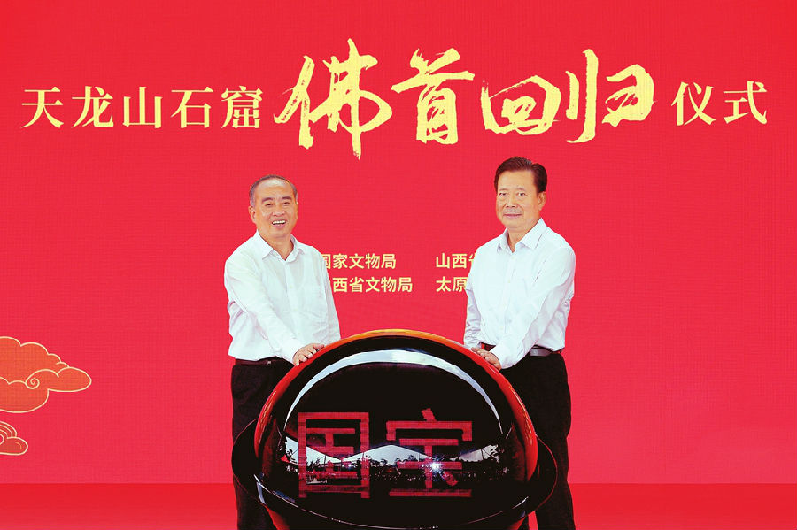 本报讯(记者张巨峰 陈俊琦 曹婷婷)7月24日,天龙山石窟佛首回归仪式在太原举行,流失海外近一个世纪的天龙山石窟第八窟北壁主尊佛首重归故土。省委书记、省人大常委会主任林武,文化和旅游部副部长、国家文物局局长李群出席回归仪式,共同为“复兴路上国宝归来”特展揭幕。省委副书记、省长蓝佛安出席并致辞。省委常委、太原市委书记罗清宇致辞。省委常委、宣传部长吕岩松,省委常委、秘书长李凤岐,佛首捐赠人张荣出席。副省长张复明主持。